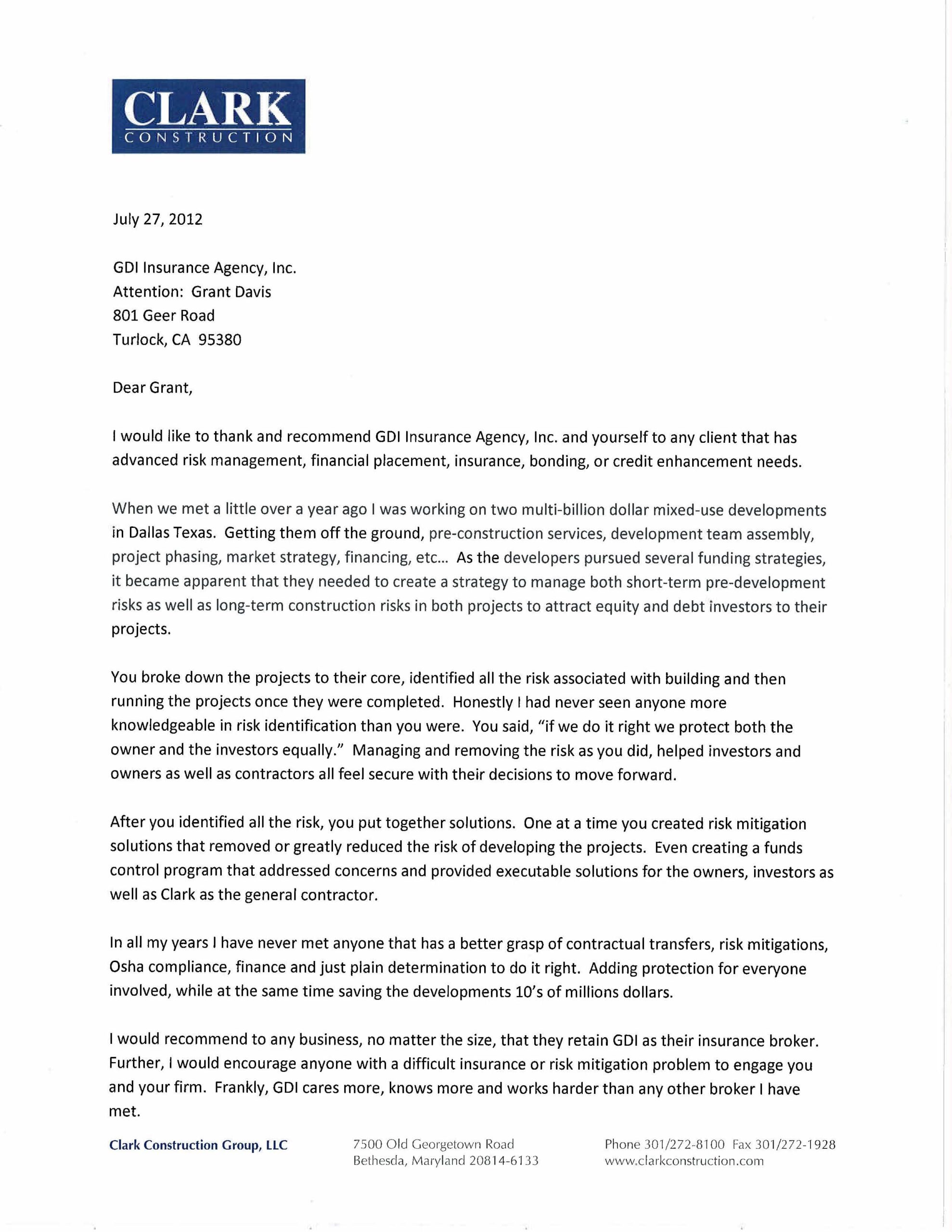 GDI Insurance Agency, Inc. Attention: Grant Davis 801 Geer Road Turlock, CA 95380 Dear Grant, I would like to thank and recommend GDI Insurance Agency, Inc. and yourself to any client that has advanced risk management, financial placement, insurance, bonding, or credit enhancement needs.