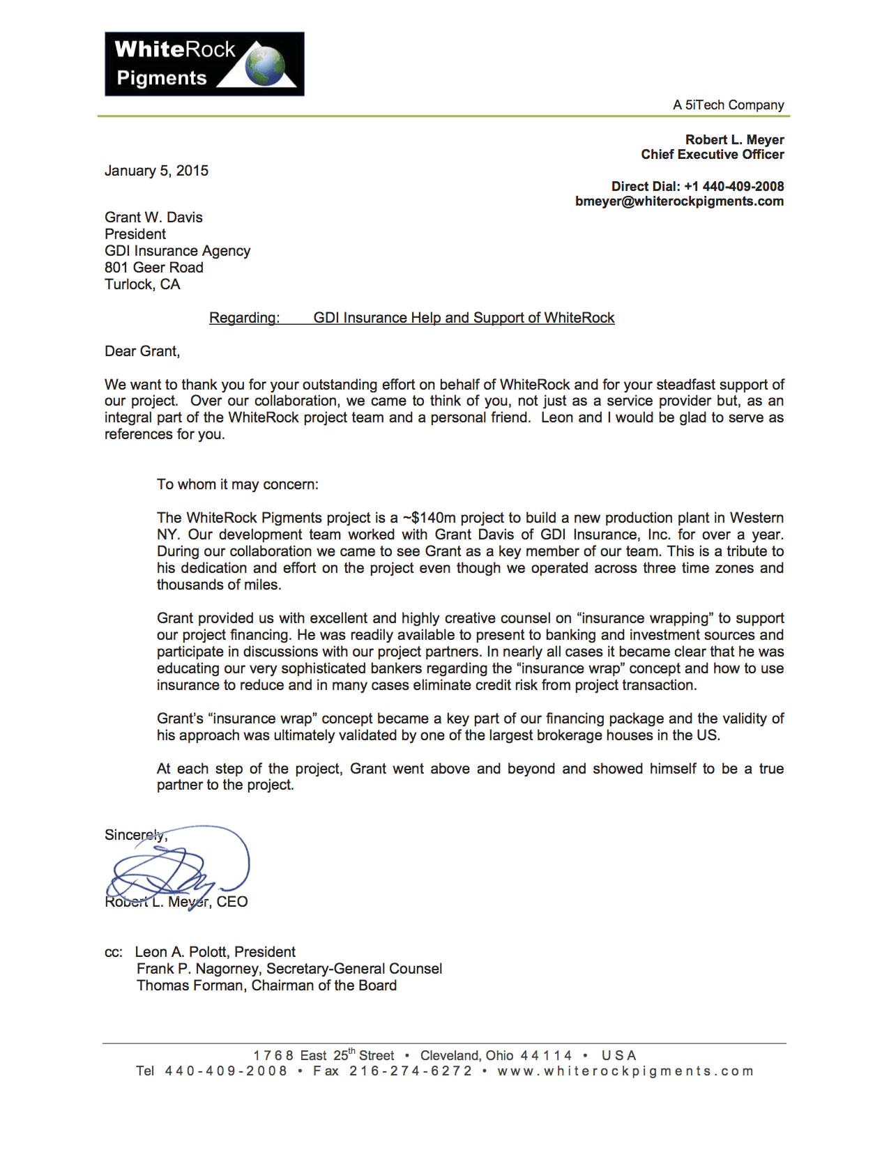 - Client Letters of Recommendation: Here are two letters of recommendations to BRG's Insurance agency partner, GDI Insurance, regarding a credit enhancement structure that BRG designed with GDI for the clients. The first is from Clark Construction Companies Senior Director of development and the second is from the CEO of White Rock Pigments.